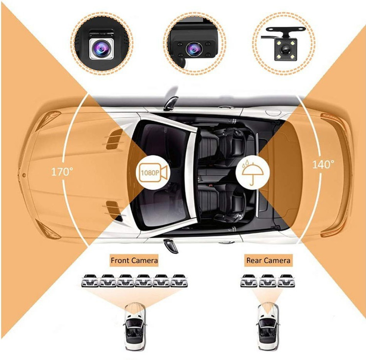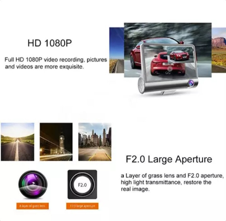 فیلم برداری چند منظوره فیلم HDR، ضبط حلقه ضبط ویدیو با لنز فوق عریض 170 درجه، صفحه نمایش 4 اینچی IPS 1080P HD، تشخیص حرکت، سنسور G، نور پرکننده دید در شب، مانیتور پارکینگ، کارت TF پشتیبانی، و غیره